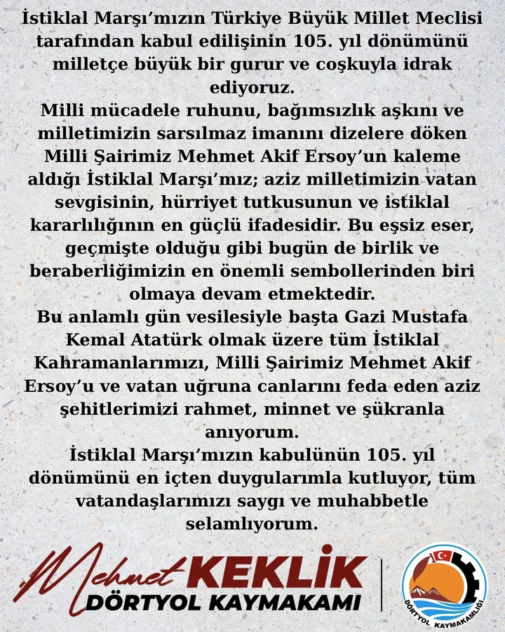 Dörtyol Kaymakamı Mehmet Keklik mesajında; “İstiklal Marşı’mızın Türkiye Büyük Millet Meclisi tarafından kabul edilişinin 105. yıl dönümünü milletçe büyük bir gurur ve coşkuyla idrak ediyoruz.