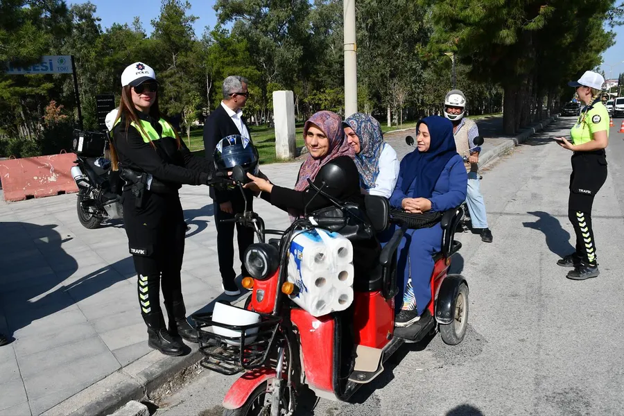 Uygulama kapsamında sürücülere kask takmanın önemi hatırlatılırken, kasksız trafiğe çıkan motosiklet sürücülerine ücretsiz kask dağıtıldı.