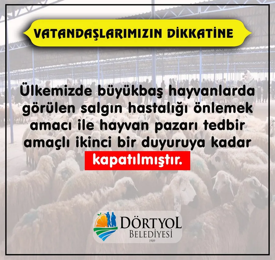 Son zamanlarda büyükbaş hayvanlarda görülen salgın hastalığı önlemek amacı ile Dörtyol hayvan pazarı tedbir amaçlı ikinci bir duyuruya kadar kapatıldı.