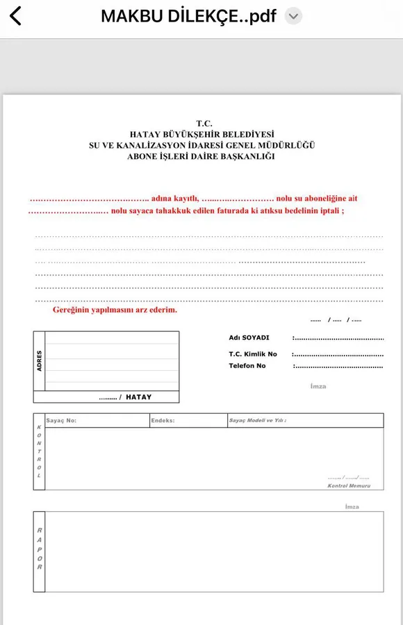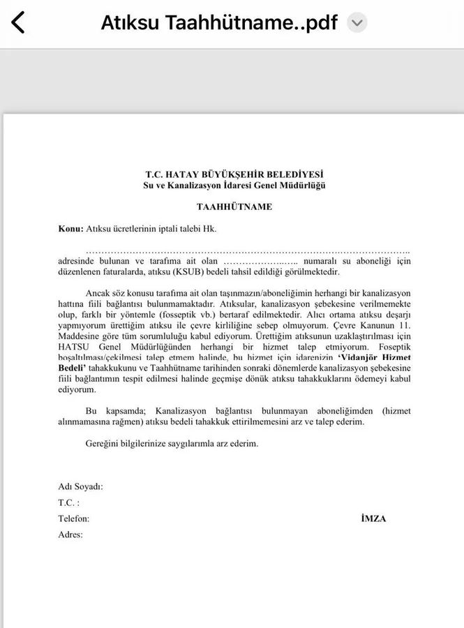 AK Parti Dörtyol Belediye Meclis Üyesi Osman Görgen sosyal medya hesabından kanalizasyon şebekesi olmayan abonelerin atık su bedelinin iptali için Hatsu şube müdürlüklerine verecekleri dilekçe ve taahhütname ile başvurmaları gerektiğini duyurdu.
