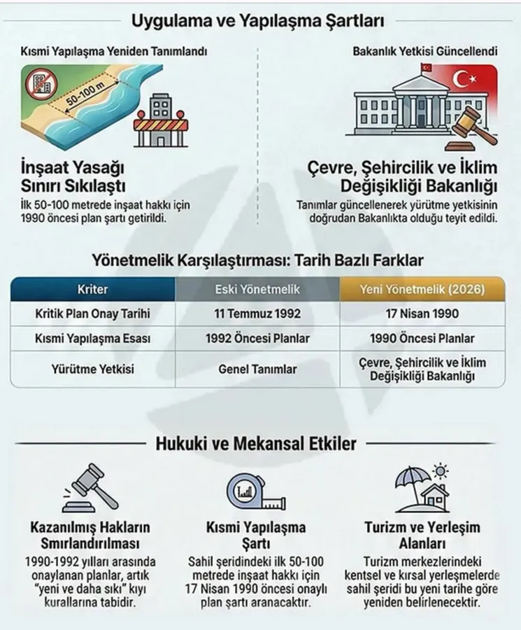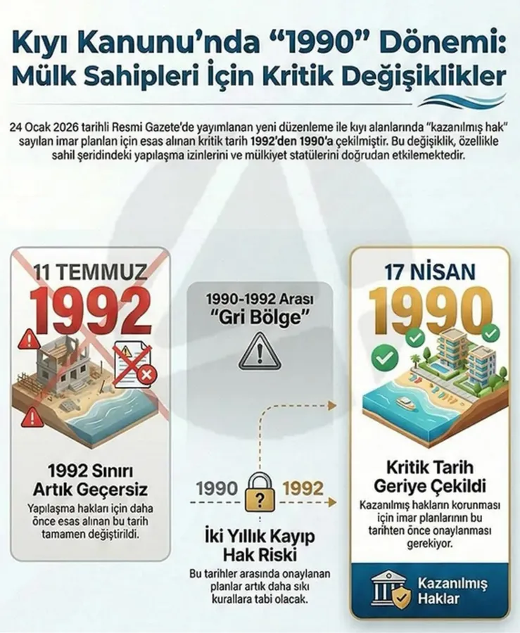Yönetmelikte yapılan en dikkat çekici değişiklik, kıyı alanlarında “kazanılmış hak” kabul edilen milat tarihinin geri çekilmesi oldu. Daha önce 11 Temmuz 1992 olarak uygulanan tarih, yeni düzenlemeyle 17 Nisan 1990’a alındı. Bu durum, Samandağ’dan Arsuz’a, Dörtyol’dan Payas’a kadar uzanan sahil bandında 1990-1992 yılları arasında planlara dayanarak işlem yapan birçok mülk sahibinin hukuki statüsünü doğrudan etkileyebilecek.