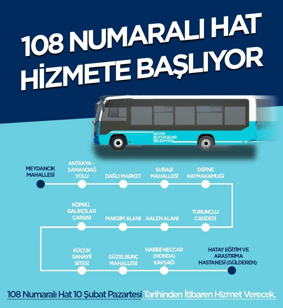 Düzenlemeler kapsamında Meydancık Mahallesi, Balıkçılar Çarşısı, Küçük Sanayii Sitesi ve Habibineccar Kavşağı güzergâhında Defne ve Antakya’yı birbirine bağlayacak 108 numaralı hat 10 Şubat Pazartesi tarihinden itibaren hizmet verecek.
