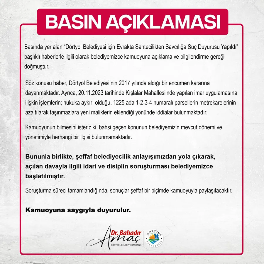 Basında yer alan “Dörtyol Belediyesi için Evrakta Sahtecilikten Savcılığa Suç Duyurusu Yapıldı” başlıklı haberlerle ilgili olarak belediyemizce kamuoyuna açıklama ve bilgilendirme gereği doğmuştur.