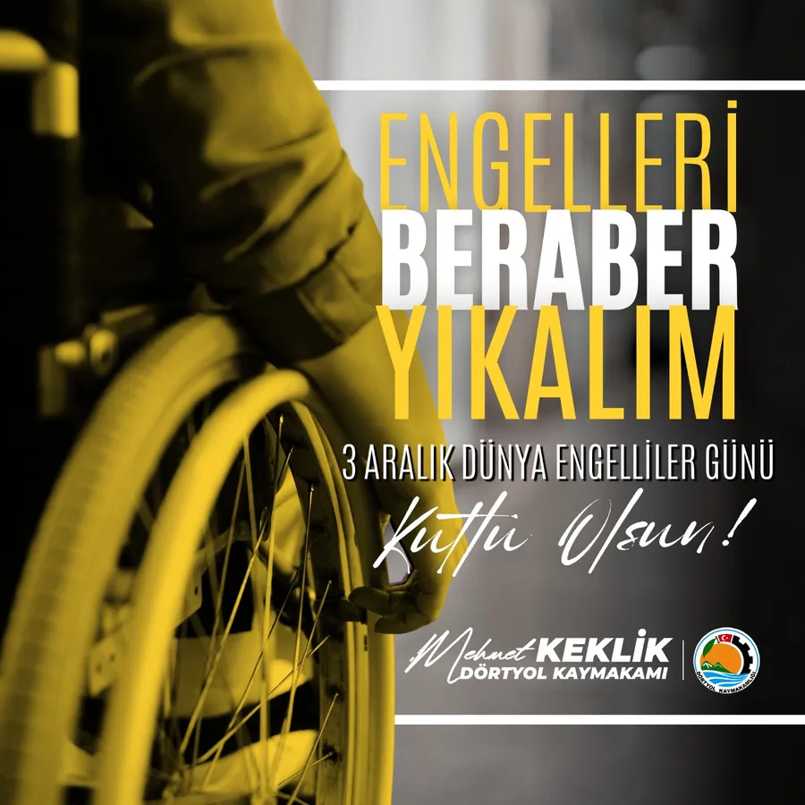 Dörtyol Kaymakamı Mehmet Keklik mesajında; “3 Aralık Dünya Engelliler Günü, toplumumuzun tüm fertleri için farkındalık ve duyarlılık oluşturmanın önemli bir vesilesidir. Engelli vatandaşlarımızın hayatın her alanına eşit ve aktif katılımını desteklemek, onların karşılaştıkları engelleri kaldırmak ve yaşam kalitelerini yükseltmek hepimizin ortak sorumluluğudur.