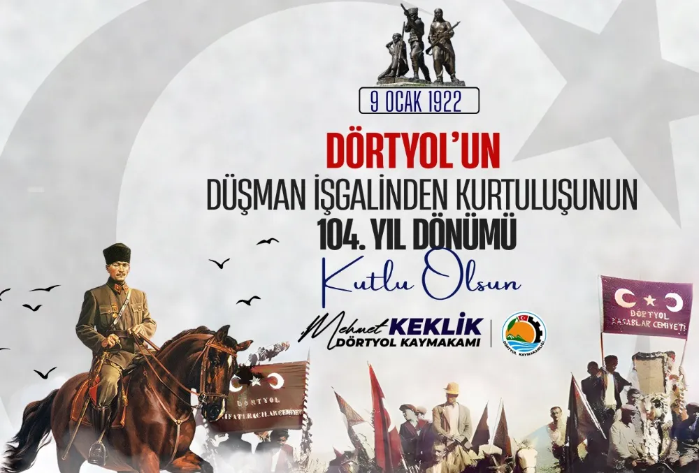 Dörtyol Kaymakamı Mehmet Keklik, ilçenin düşman işgalinden kurtuluşunun 104. yıl dönümünü yayımladığı mesajla kutladı.