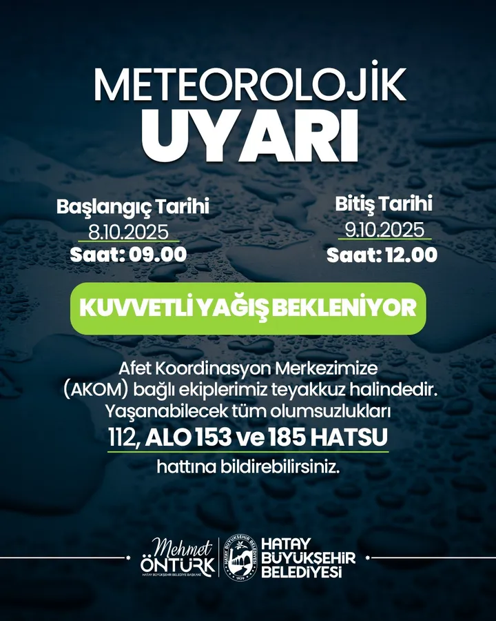 Meteoroloji Genel Müdürlüğünün Doğu Akdeniz'de yerel kuvvetli gök gürültülü sağanak yağış beklendiği uyarısı üzerine AKOM’a bağlı Büyükşehirin tüm birimlerinin teyakkuza geçtiği belirtildi.