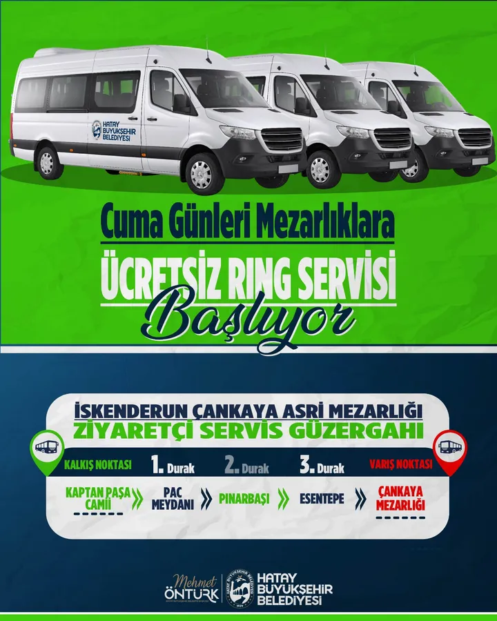 Arsuz, İskenderun, Samandağ, Antakya, Dörtyol, Kırıkhan ve Reyhanlı’da her cuma günü 09.00 ile 15.00 saatleri arasında asri mezarlık ziyaret araçları ücretsiz olarak vatandaşlara hizmet verecek.