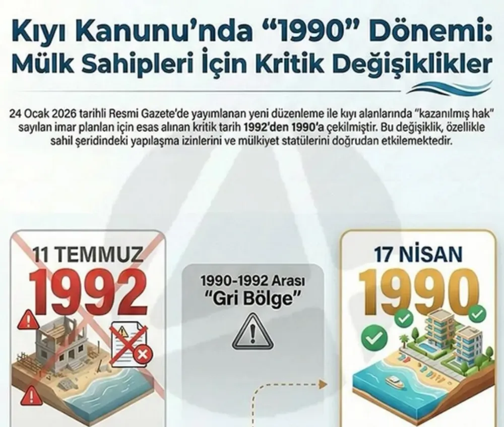 Yönetmelikte yapılan en dikkat çekici değişiklik, kıyı alanlarında “kazanılmış hak” kabul edilen milat tarihinin geri çekilmesi oldu. Daha önce 11 Temmuz 1992 olarak uygulanan tarih, yeni düzenlemeyle 17 Nisan 1990’a alındı. Bu durum, Samandağ’dan Arsuz’a, Dörtyol’dan Payas’a kadar uzanan sahil bandında 1990-1992 yılları arasında planlara dayanarak işlem yapan birçok mülk sahibinin hukuki statüsünü doğrudan etkileyebilecek.