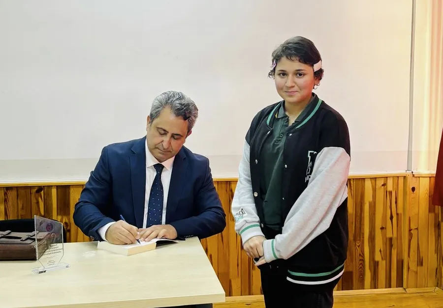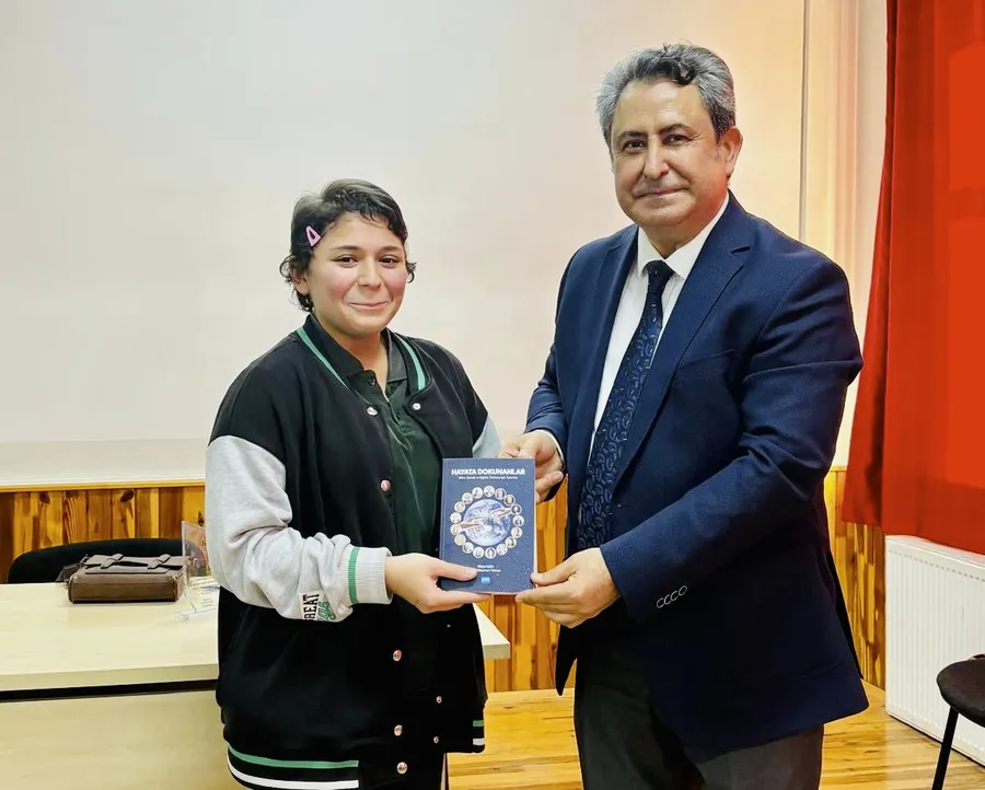 Söyleşi sonunda Profesör Yılmaz, soruları cevapladı, yılda en çok kitap okuyan öğrenci Emine Betül Gül’e “Hayata Dokunanlar” kitabını imzalayıp takdim etti. Okul müdürü Mahmut Güneş tarafından Profesör Yılmaz’a plaket takdim edildi.