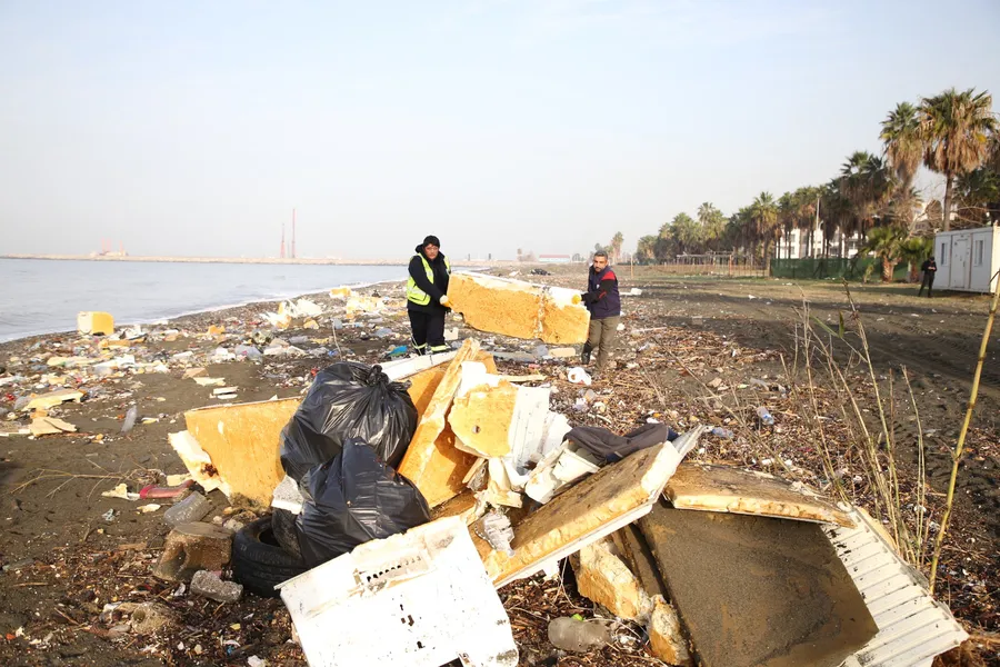 Sağanak yağmurun etkisiyle Dörtyol Dörttaş Sahiline derelerden deşarj olan ve biriken katı atıkları temizleyen HBB ekipleri. 2 km’lik kıyı şeridinde çevre kirliliğinin önüne geçmek adına yaptığı çalışmalarda 30 ton civarında katı atığın temizlenmesini sağladı.